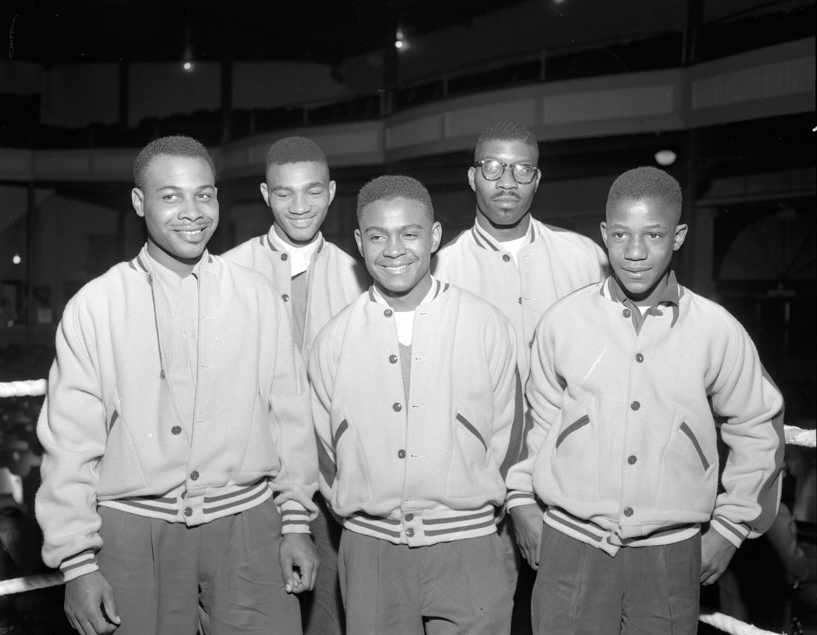 1950 Novice Champions. (from left to right) James Fisher, Lexington, light-heavyweight; Edward Martin, Lexington, middleweight; Russell McNeal, Lexington, lightweight; LeRoy Garvin, Kentucky State College, heavyweight; Charles Kennedy, Greendale, bantamweight. 1950 January 25